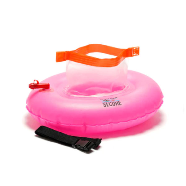 The Swim Secure Tow Donut is a highly visible tow float swim buoy with waist strap and an integrated dry bag pouch. The small dry bag sits in the centre of the donut, out of the water, and is perfect for small items such as car keys and phone.